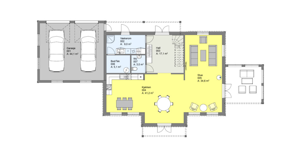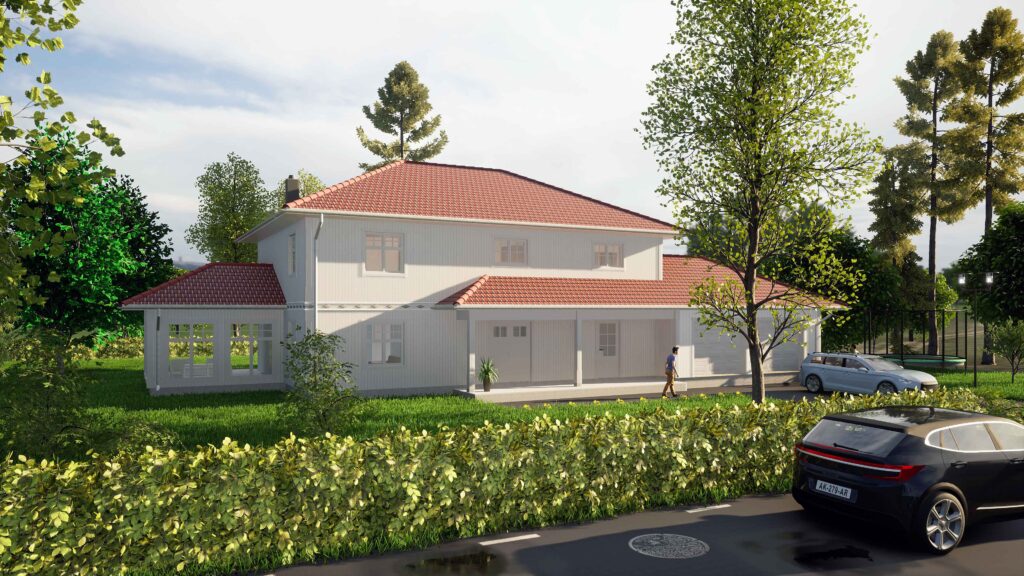 Alexandra er en storslått bolig over to plan for deg som trives med god plass rundt deg. Boligen ønsker velkommen med et overbygget inngangsparti, og herfra kommer du inn i en romslig hall som leder inn i husets store stue og kjøkken. Hallen har også trapp til annen etasje, og tilgang til wc og vaskerom med tilknyttet bod.