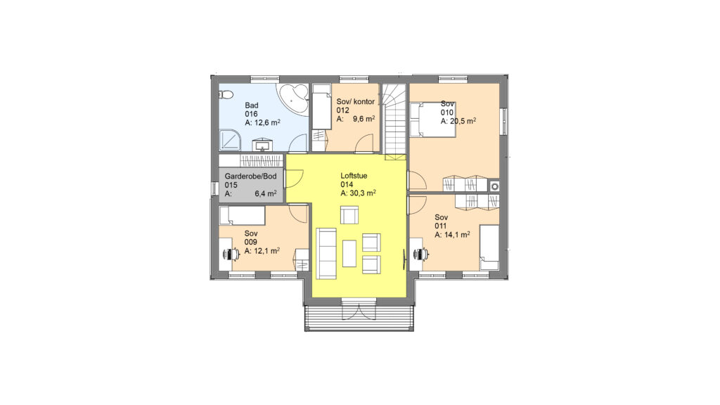 I annen etasje finner du en stor loftstue med utgang til balkong, bad, garderobe og fire soverom, eller tre soverom og kontor om du heller ønsker det. Dobbel garasje er integrert i huset, det samme er også en lun utestue. Her er mulighetene mange, uansett hva dine ønsker måtte være!