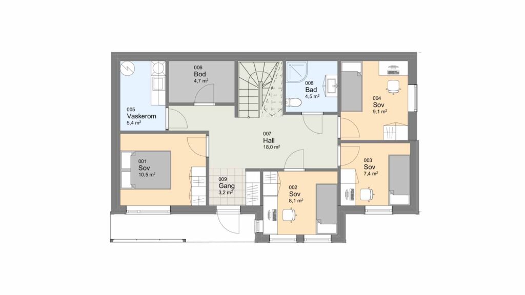 Astro er et stilig hus med saltak og et moderne uttrykk. Huset er innholdsrikt med fire soverom i første etasje, i tillegg til romslig hall, bad, stor bod og vaskerom. I andre etasje er det et soverom, toalett, og et stort og flott stue- og kjøkkenområde som gir en åpen og luftig romfølelse.