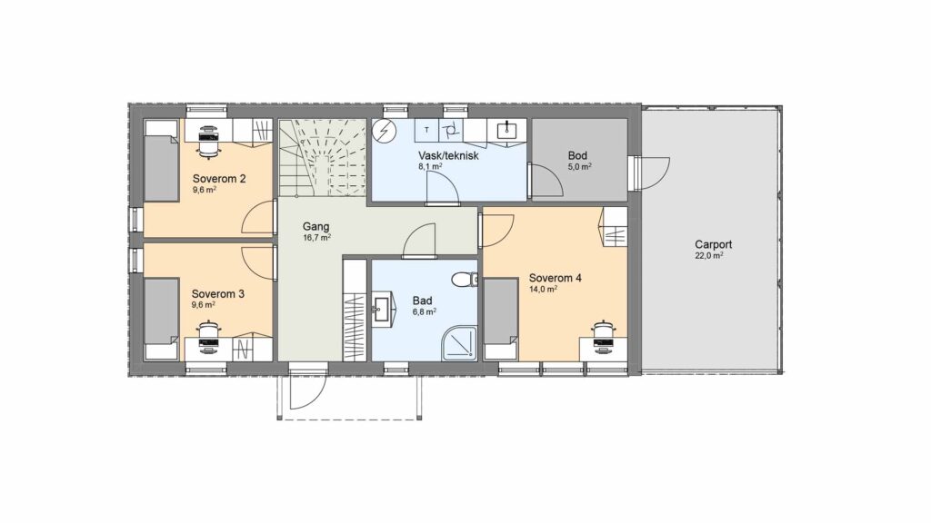 Enger er et flott to-etasjes hus som kan passe på både flate og skrå tomter. Et overbygget inngangsparti leder inn i en romslig gang med trapp og plass til garderobe. Her finnes også tre gode soverom, bad, bod, teknisk rom og vaskerom.