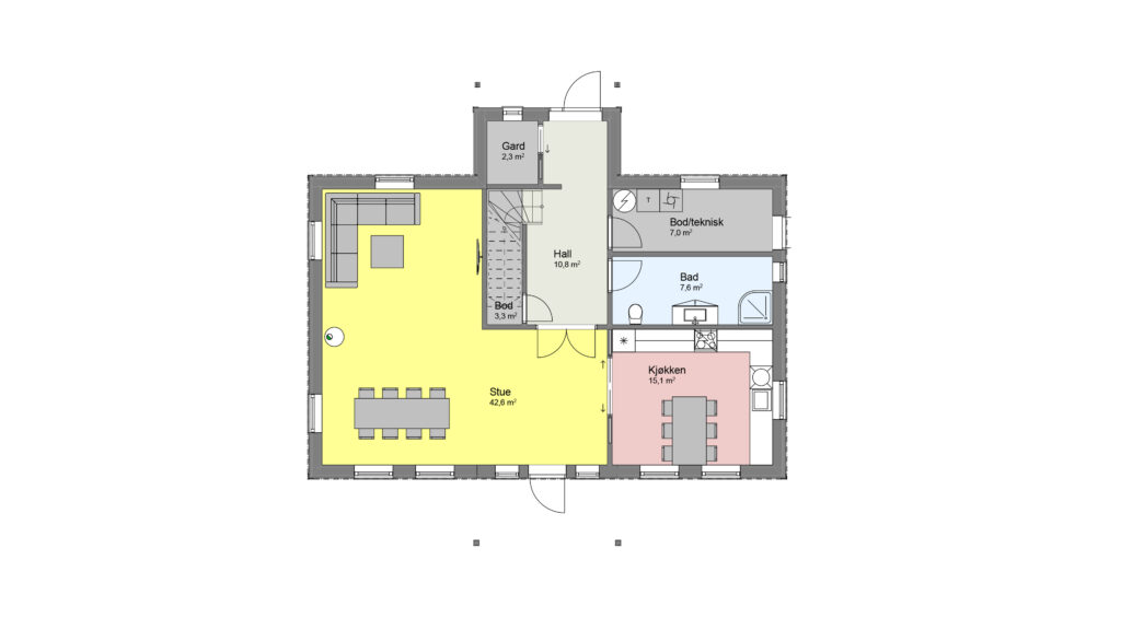 Et overbygget inngangsparti ønsker deg velkommen inn i entreen som har en praktisk garderobe til yttertøyet. Videre kommer du inn i en romslig hall med trapp, og en dobbel glassdør leder deg inn i den romslige stuen. I stuen er det god plass til langbord, og en egen tv-krok gir rom for sofakos og koselige kvelder. Kjøkkenet er lyst og luftig med store vinduer, og har mye skapplass og plass til spisegruppe.