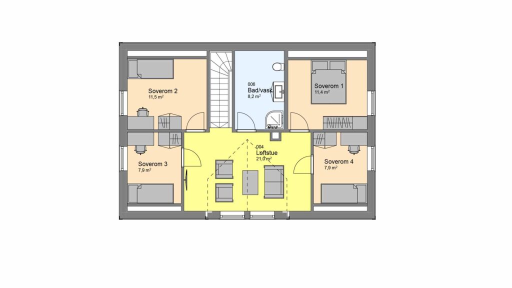 Linnerud er et klassisk hus i halvannen etasje for flate tomter. Her kommer du inn i en romslig hall med trapp, som leder deg inn til stue og kjøkken på over 50 kvadratmeter.