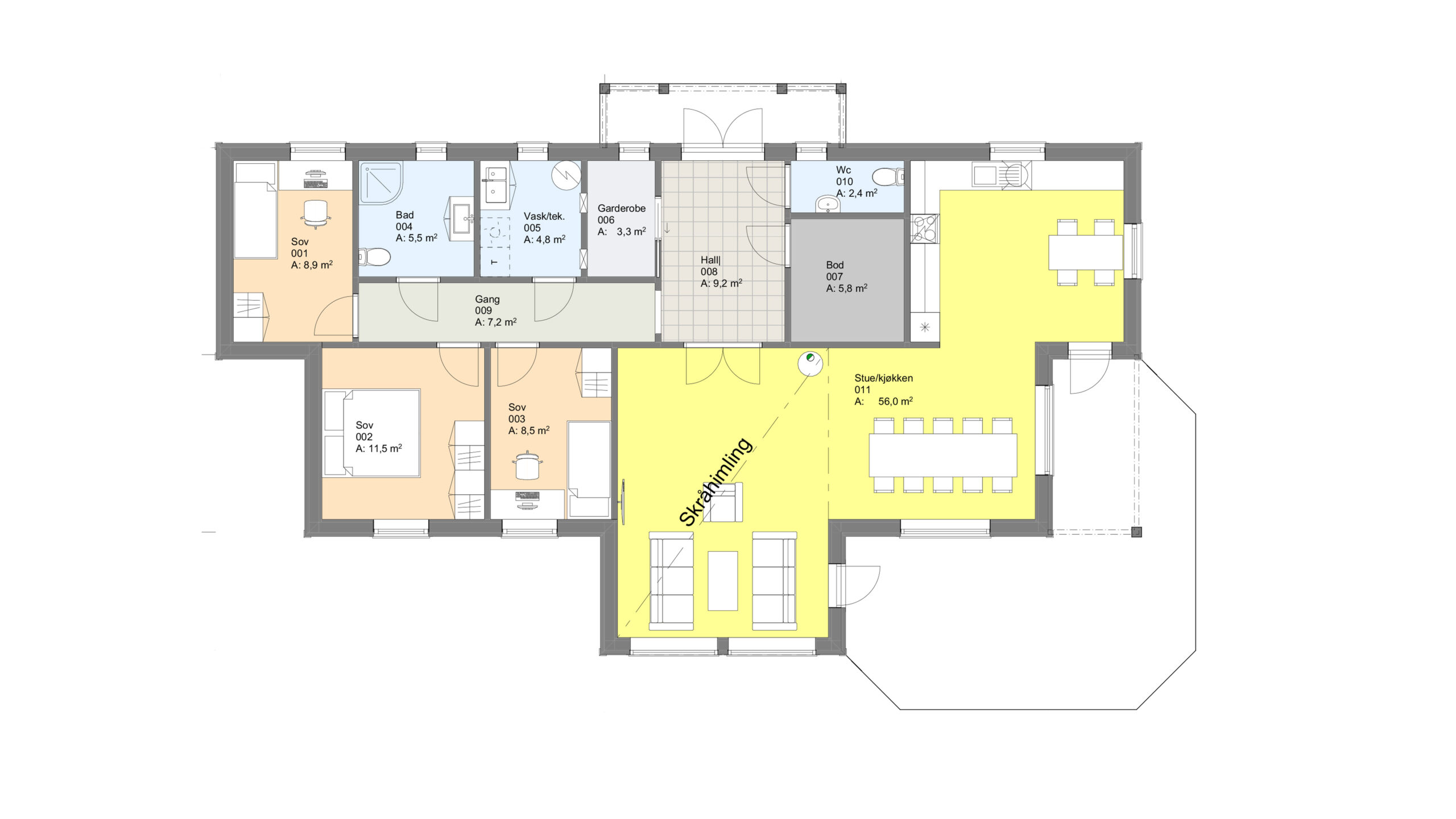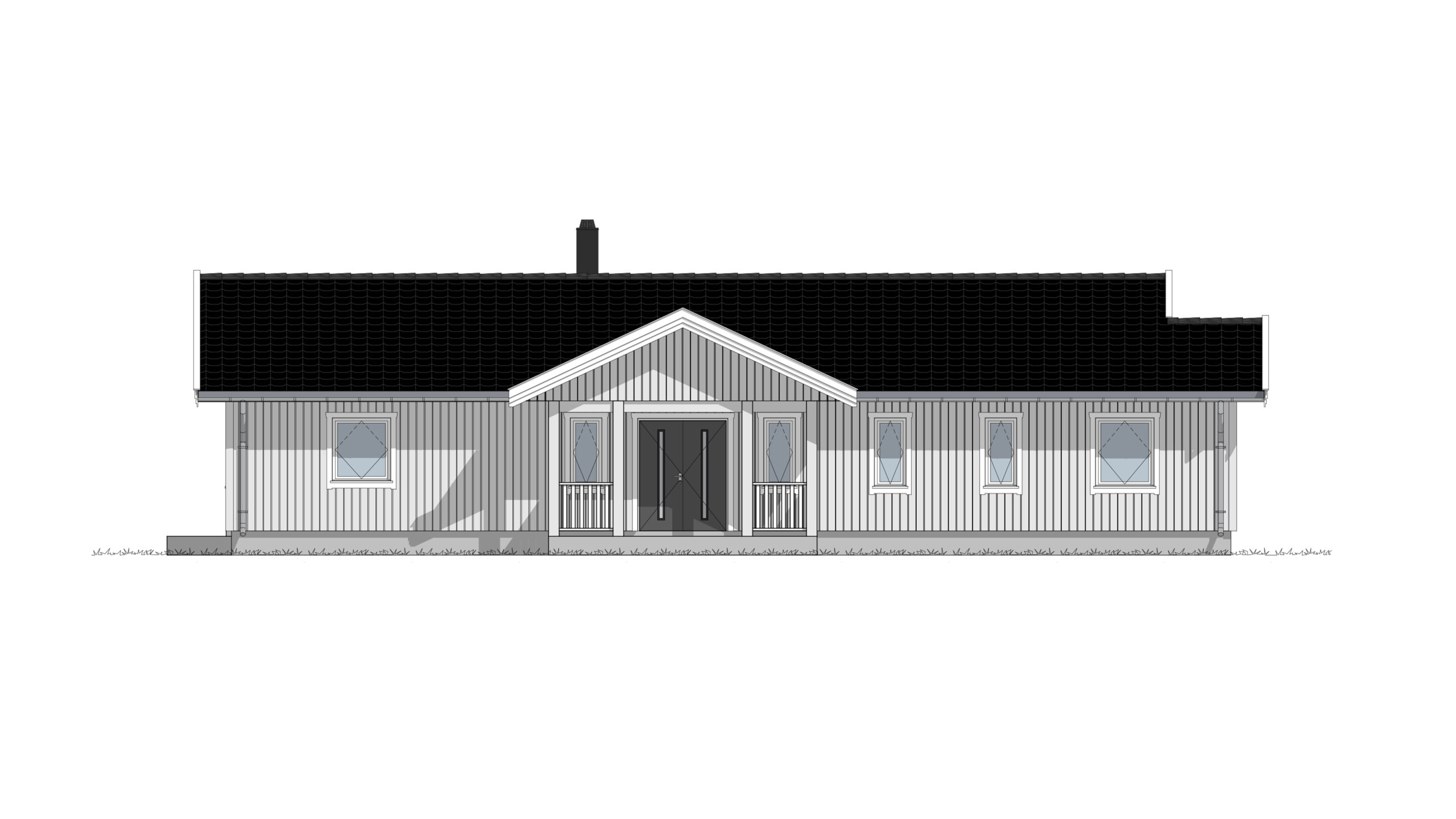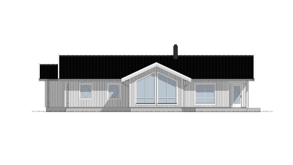 En stilfull villa i én etasje for flate tomter, med et innbydende inngangsparti. Dobbel inngangsdør leder deg inn i hallen som har en praktisk garderobeløsning, wc og en stor bod. Fra hallen er det doble glassdører inn til en stue med store vinduer som gir en luftig følelse og mye lys. Spisestua har plass til de store selskapene, og på kjøkkenet er det plass til spisegruppe.