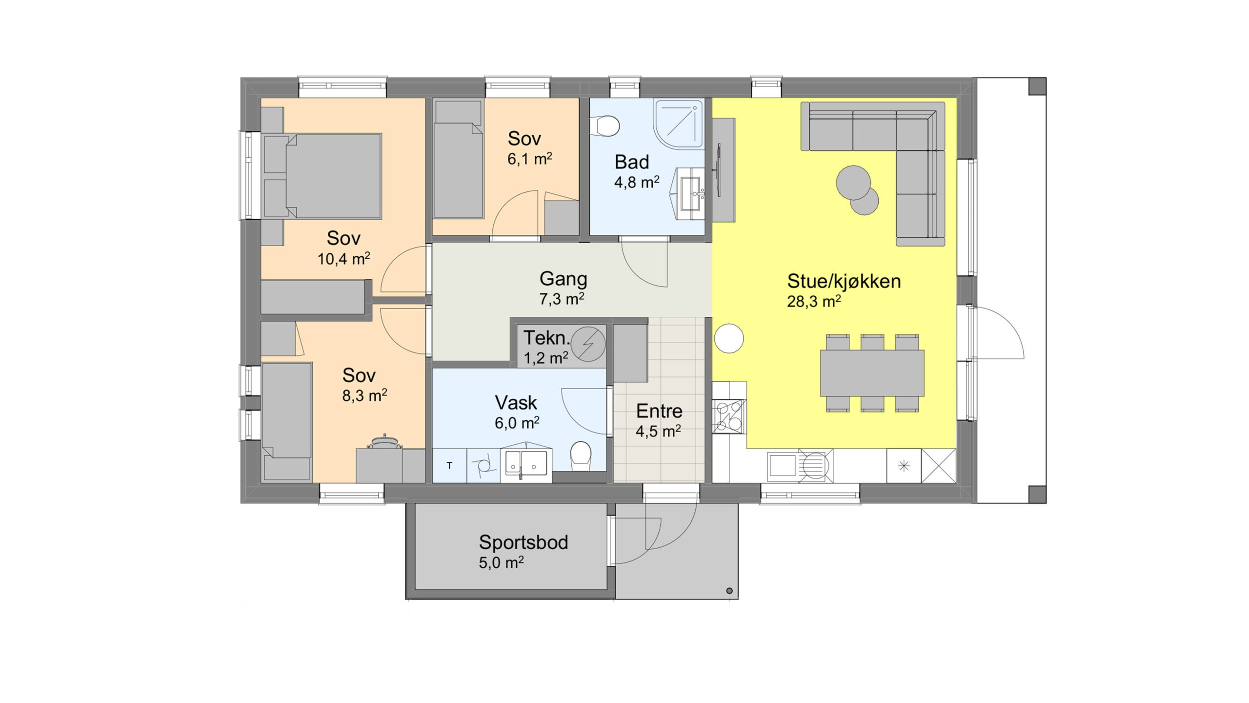 I stuen er det også utgang til delvis overbygget uteplass. Entréen har inngang til vaskerom rett innenfor døren, noe som er praktisk ved sølete og regnfulle dager. Boligen inneholder også tre soverom, bod og bad, her har du alt du trenger innen rekkevidde