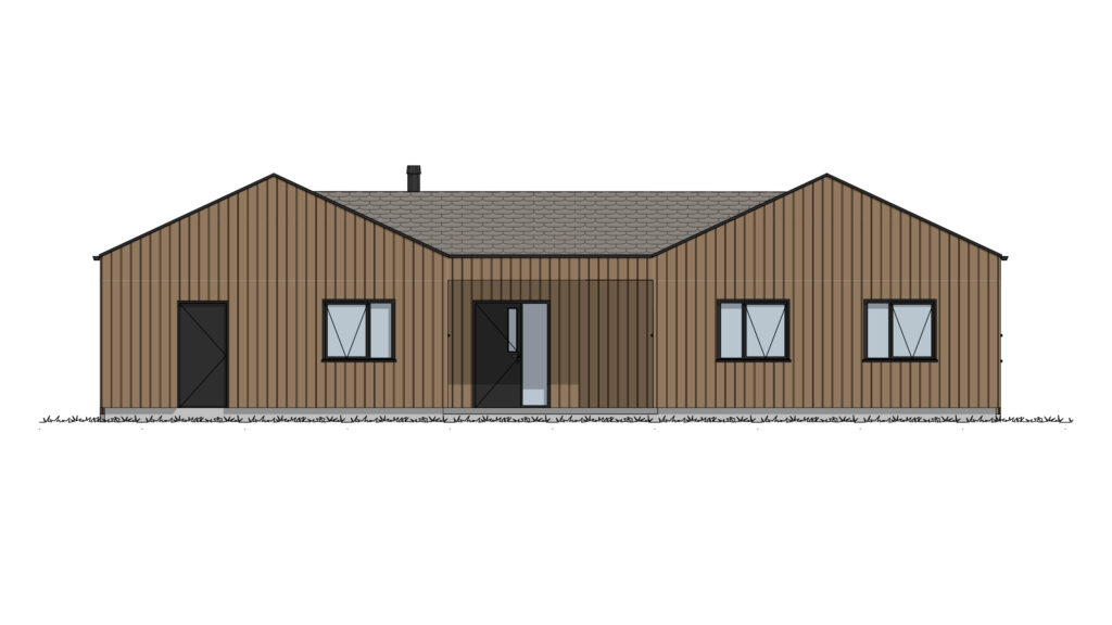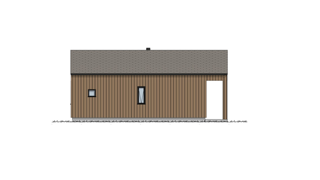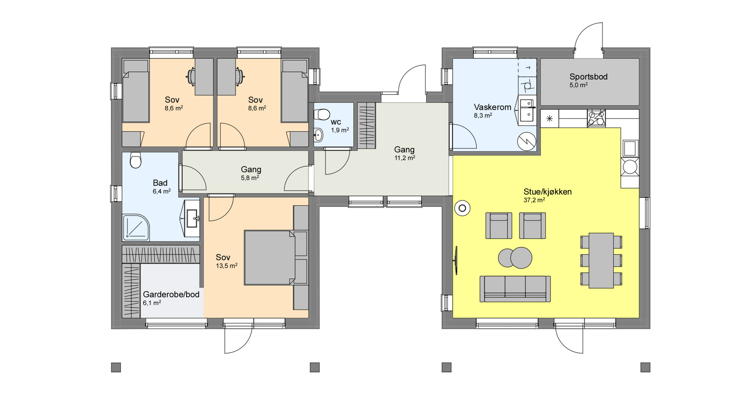 Et overbygget og lunt inngangsparti ønsker velkommen inn i en lys og åpen hall, som leder deg inn i en luftig stue- og kjøkkenløsning som har de samme store vinduene vi finner på alle Økosmart-modellene. Et romslig vaskerom og sportsbod har også plass i denne fløyen. Soveromsavdelingen er praktisk adskilt fra oppholdsrommene, noe som gir ro for barna eller de som ønsker å ta en tidlig kveld. Et stilig og praktisk hus!