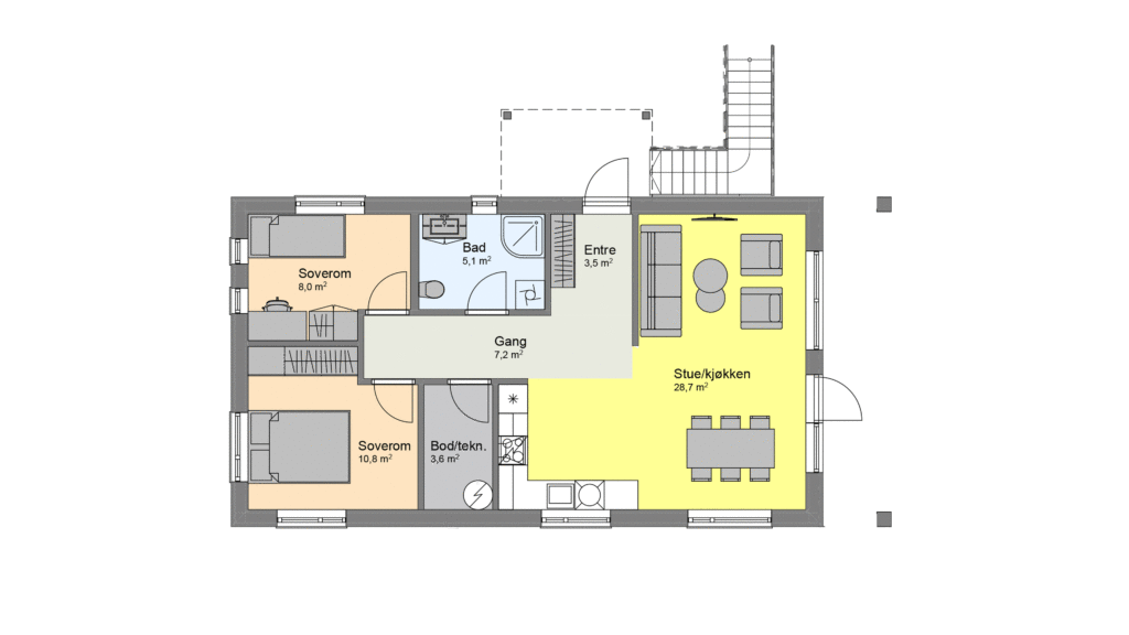 Økosmart X2 er vår eneste horisontaldelte tomannsbolig, så her er hver etasje én leilighet. Hver av boenhetene har gang med plass til garderobeskap, bad med plass til vaskemaskin, et foreldresoverom og et mindre soverom. Bod/teknisk rom gir rom for oppbevaring.