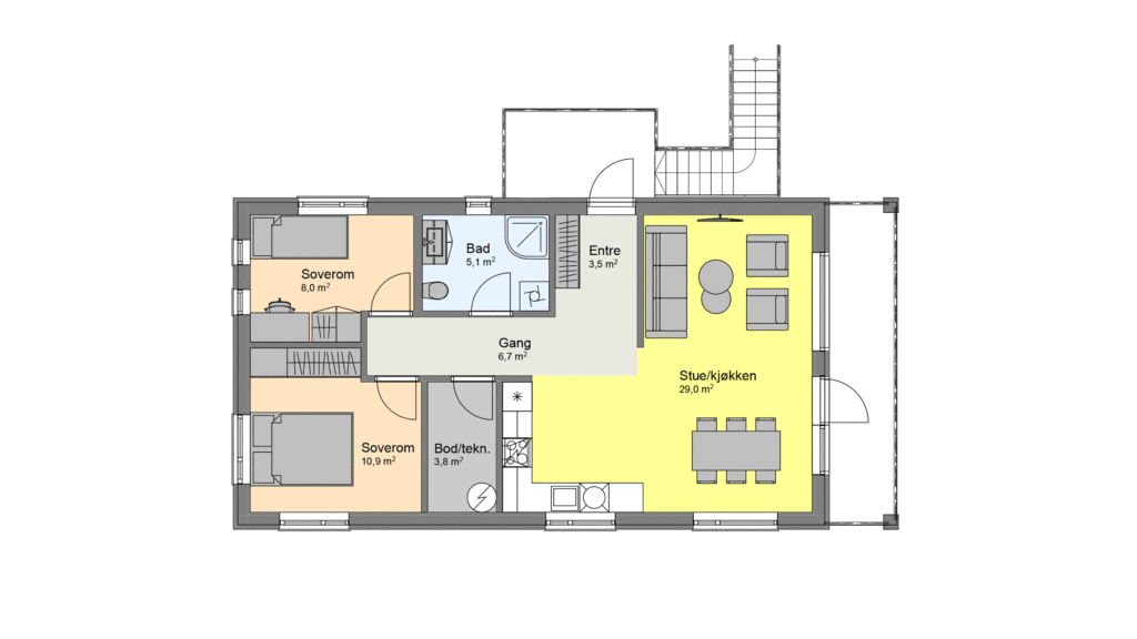 Et åpent stue- og kjøkkenområde med store vinduer gir leilighetene lys og luft, og leiligheten i andre etasje har også vinduer i gavl og åpen himling i stue. Begge leilighetene har utgang til overbygget veranda/uteplass. En fin tomannsbolig med et lite fotavtrykk.