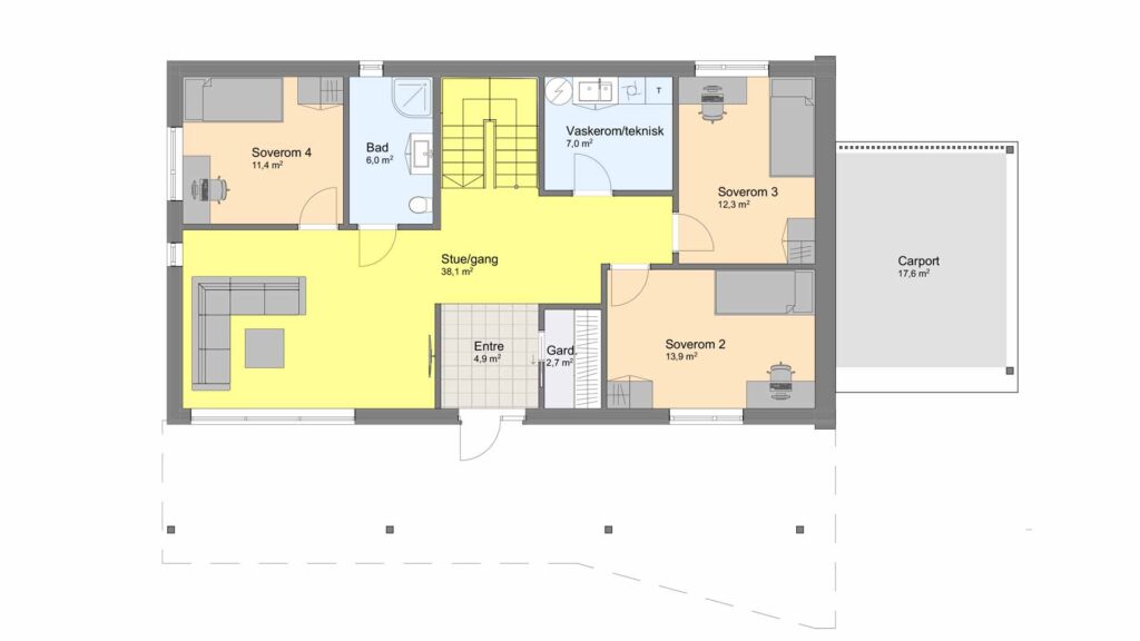 I første etasje kommer du inn i entréen hvor du har en praktisk garderobe med plass til både klær og sko. Videre finner du en romslig tv-stue med store vinduer, tre store soverom, bad og vaskerom.