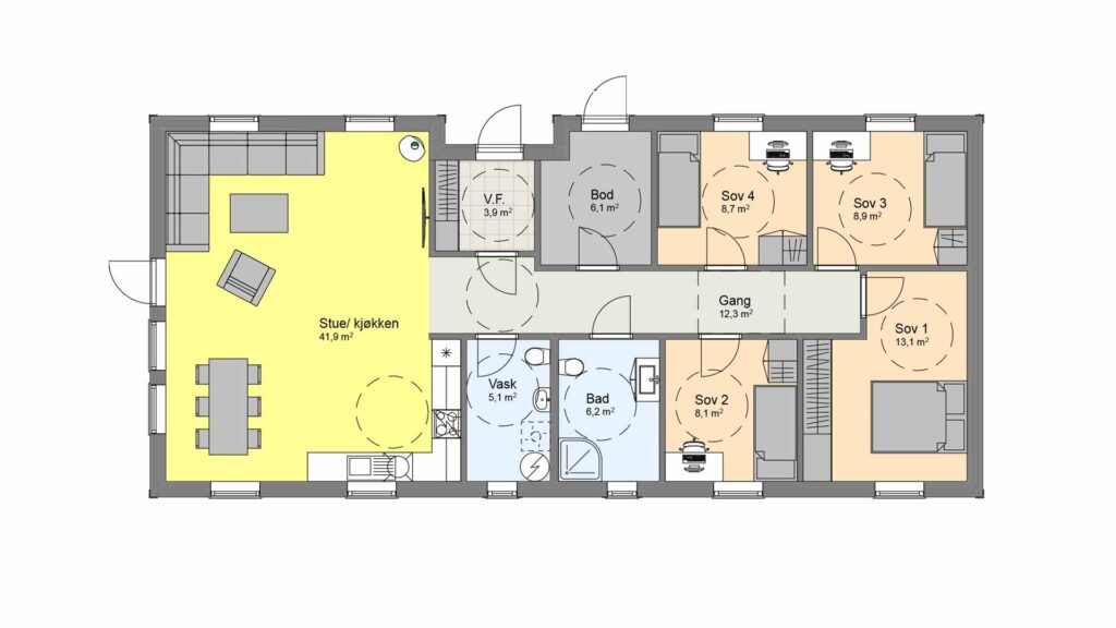 Det er en åpen stue/kjøkken-løsning på hele 41,9 m². Huset rommer 4 soverom som er plassert på motsatt side av boligen, godt avgrenset fra den sosiale sonen – som gir ro for den som vil legge seg tidligere. Huset har eget vaskerom med toalett, samt et romslig baderom.
