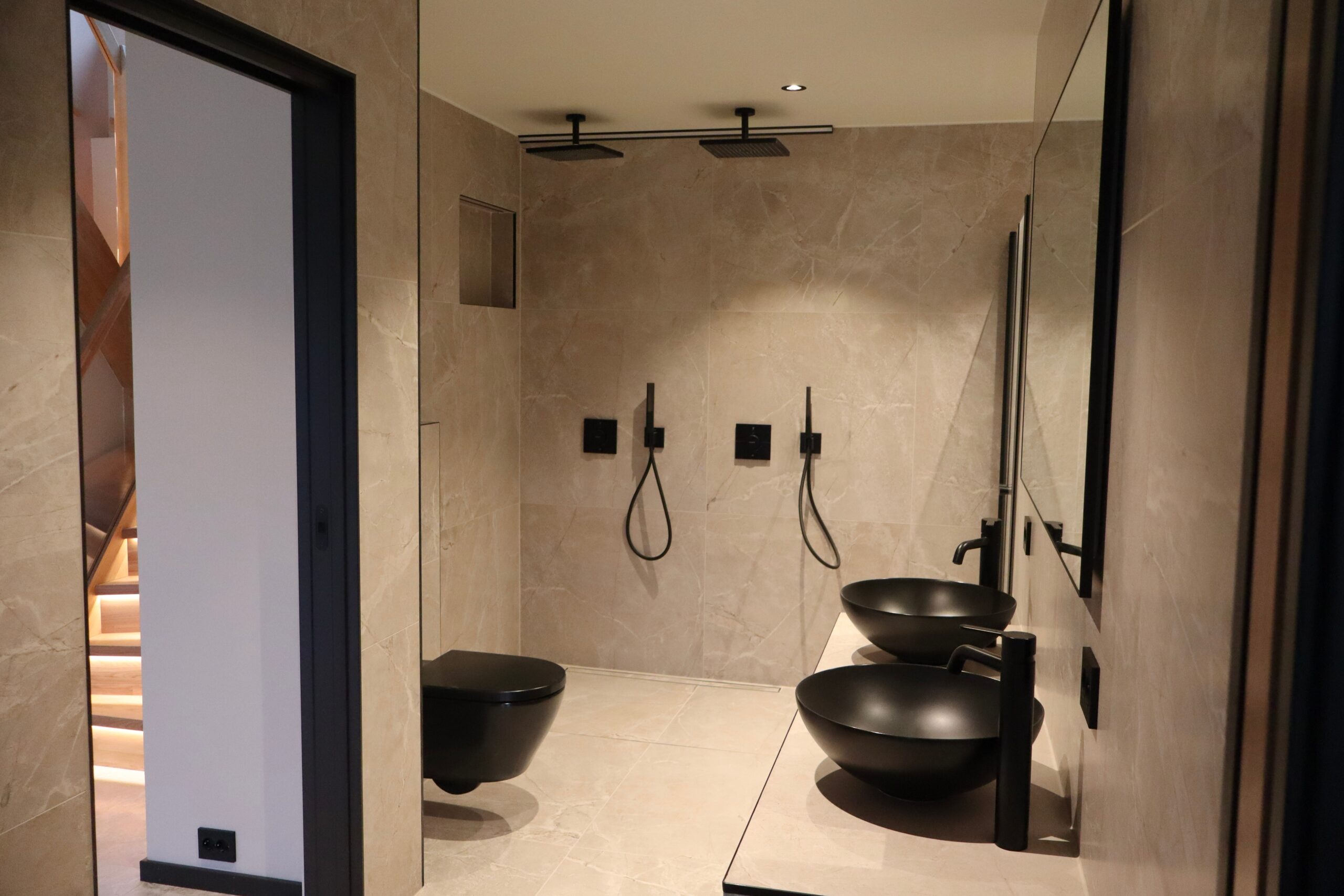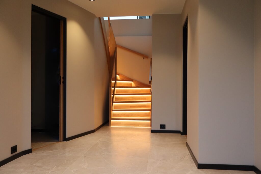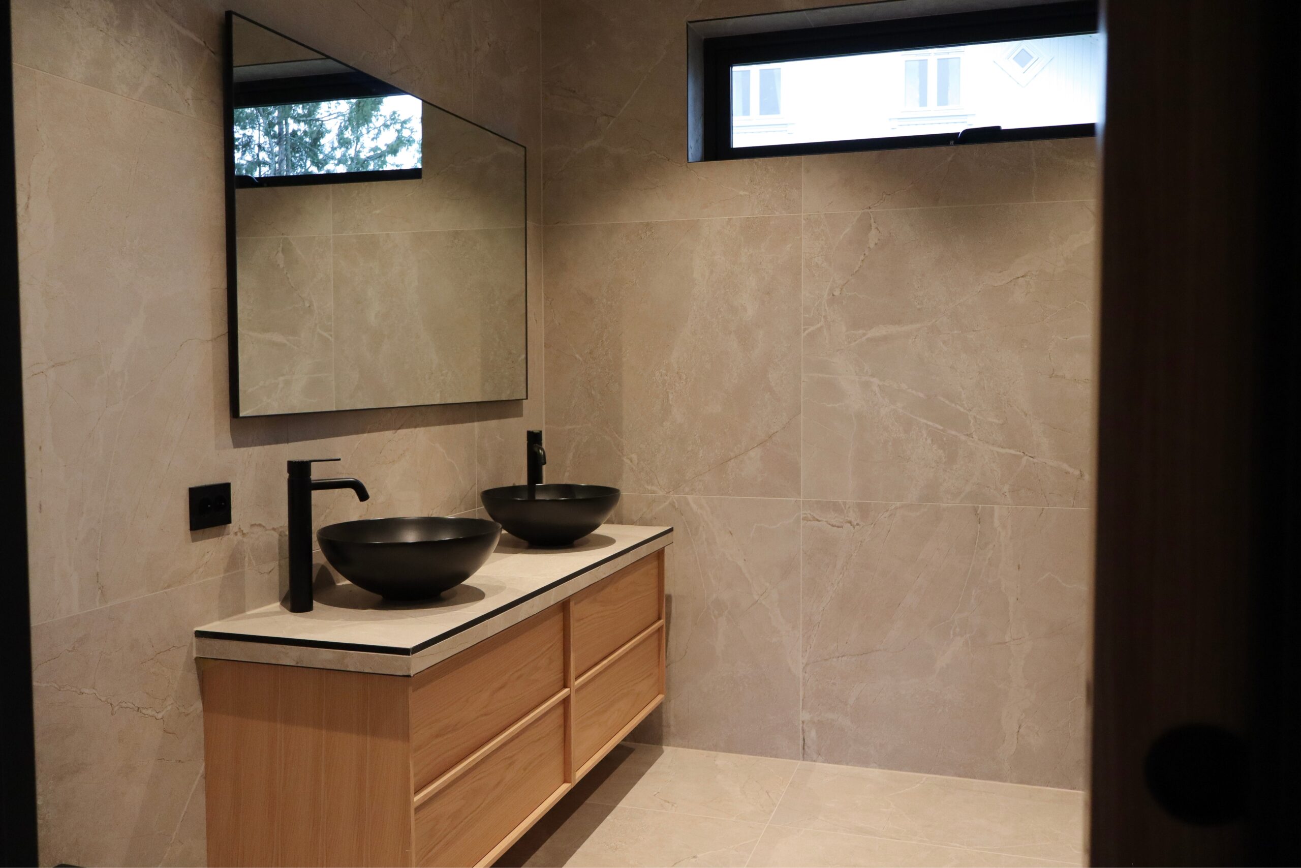 Bli inspirert av denne moderne boligen – med lekre detaljer. Her har kunden valgt lekre detaljer som benkeplate på baderomsmøbel, laget av de samme flisene som resten av badet. I entreen blir du møtt av store fliser og en trapp med lys under trinnene.