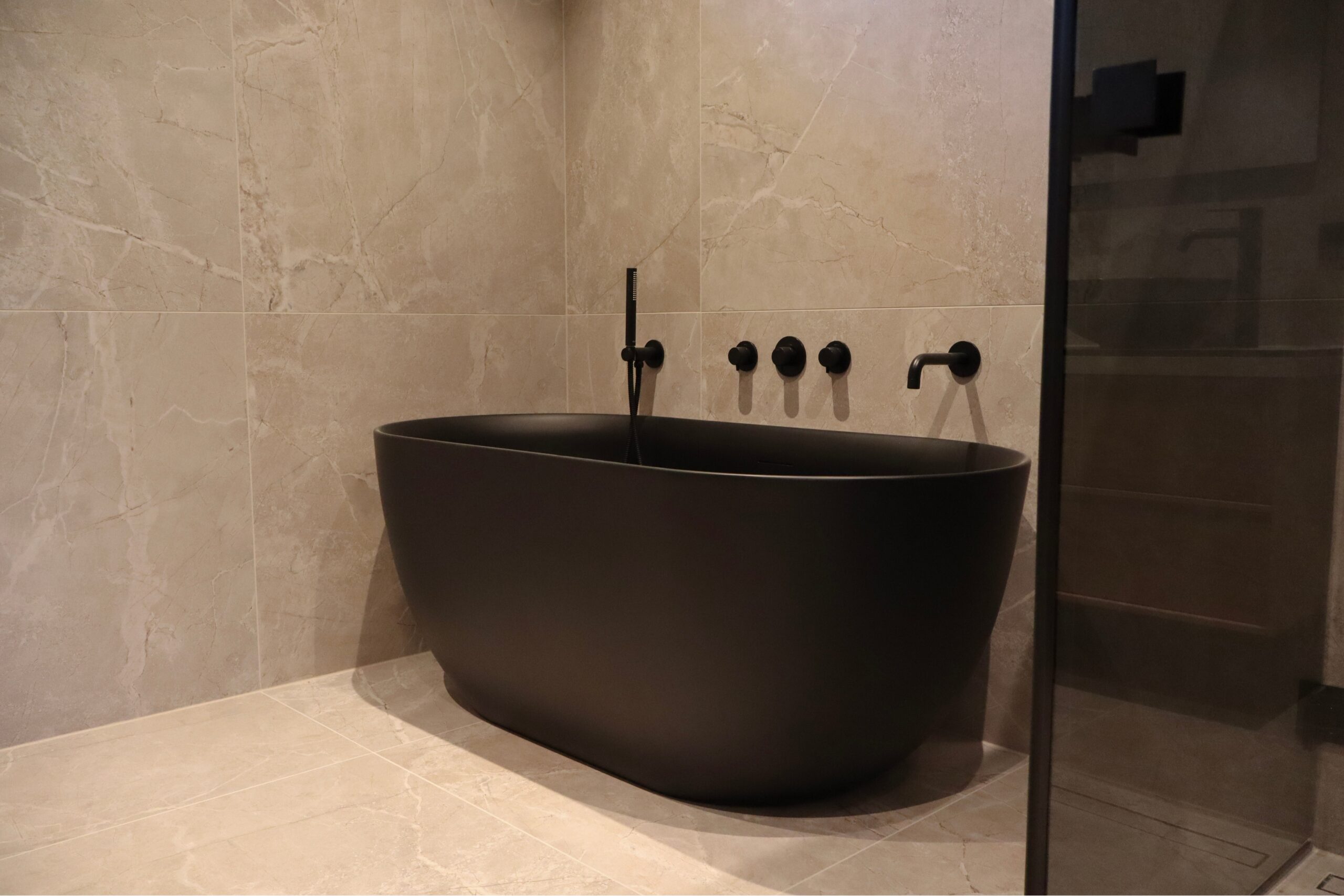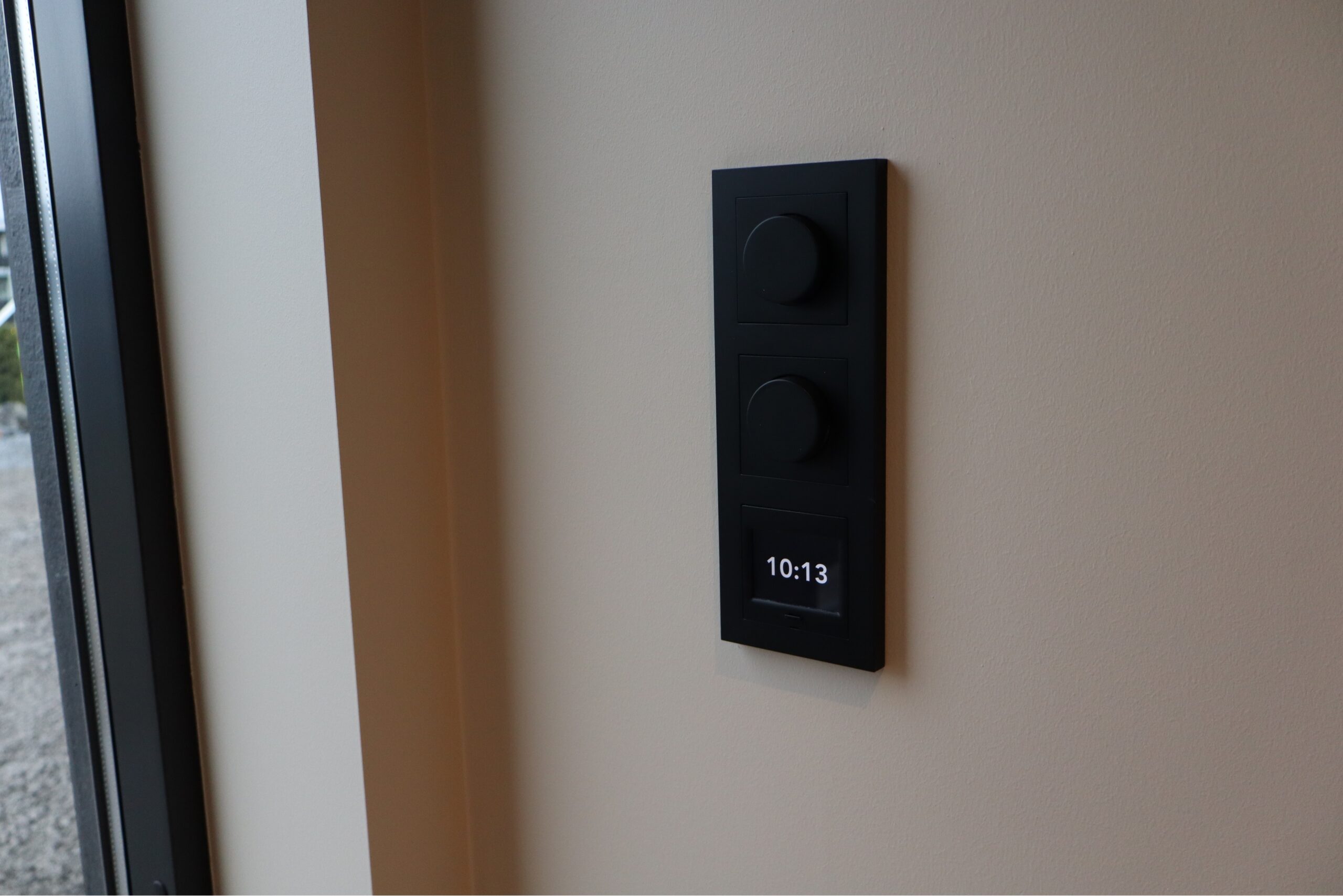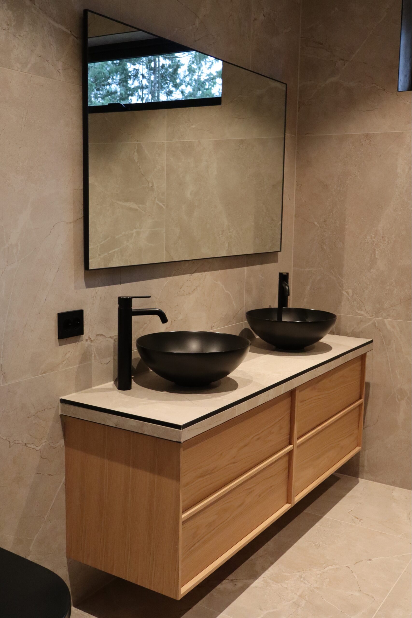 Bli inspirert av denne moderne boligen – med lekre detaljer. Her har kunden valgt lekre detaljer som benkeplate på baderomsmøbel, laget av de samme flisene som resten av badet. I entreen blir du møtt av store fliser og en trapp med lys under trinnene.